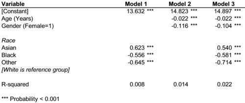 The data reported in Figure 10-11 show clear differences in educational levels between races. Asian Americans having the highest levels of education, while people of African American and "Other" race (mainly Native Americans) the lowest. An ANOVA model confirms that all three of these races have mean levels of education that are significantly different from Whites.. The categorical variable "race" is operationalized into three ANOVA variables in Model 1 of Figure 10-12. The White group is used as the reference group. The education levels of Asians, blacks, and others are all highly significantly different from those of whites, with Asians having more education and Blacks and Others less. On the other hand, despite the fact that these differences are very highly statistically significant, they explain less than 1% of the total individual variability in education. Most of the individual variability in levels of education are apparently unrelated to race. It is possible that at least some of the differences in levels of education between races in the United States is due to differences in the age and gender composition of the American population by race: age and gender may be confounding variables in Model 1. This proposition can be examined using a mixed model that controls for the numerical variable age alongside the categorical variable race. A base model using just age and gender to predict education is presented in Model 2 and a mixed model including race as well in Model 3. The coefficients of the ANOVA variables in Model 3 indicate that the gaps between Whites and Blacks and Whites and Others are actually larger after controlling for age and gender, not smaller. Controlling for age and gender, Blacks receive on average 0.581 fewer years of education than Whites, while Others receive 0.714 fewer years of education.