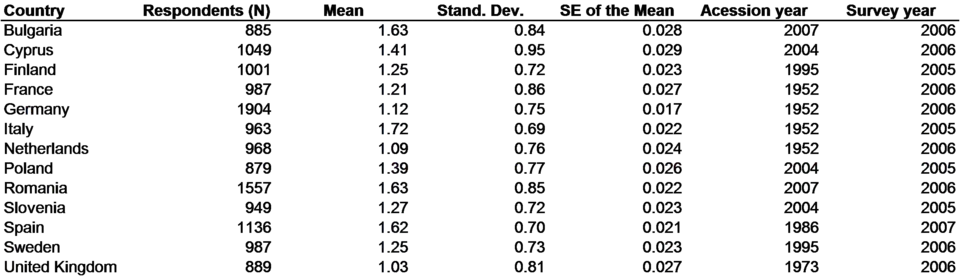 In the Twentieth Century Germany invaded its neighbors in two tragically destructive wars. World War I (1914-1919) and even more so World War II (1939-1945) left Europe in ruins. In the seven years of World War II in Europe, roughly 18 million soldiers and 25 million civilians lost their lives, including 6 million Jews systematically killed in the Holocaust. These deaths amount to around 7% of the total population of Europe at the time, or about 1 out of every 13 people. It is difficult for us today to comprehend the scale of the losses. After the slaughter of World War II, European leaders were adamant that Europe should never go to war again. In 1951 six western European countries signed a treaty that set up the European Coal and Steel Community. In the sixty years since then, this limited international partnership has evolved into a European Union (EU) of 27 countries with a combined population of over 500 million people and an economy larger than that of the United States. Today's EU is dedicated to supporting peace, development, democracy, and human rights across Europe. It does this through economic cooperation and collective decision-making in which the approval of all 27 countries is required for major decisions. Considering its 60-year track record of preventing war and promoting prosperity across Europe, we might expect European citizens to have a high level of confidence in the EU. In fact, they do not. Over the years 2005-2008 the World Values Survey (WVS) was conducted in eleven EU countries. Two additional countries (Bulgaria and Rumania) participated in the WVS in 2006 and joined the EU one year later in 2007. In all thirteen countries, survey respondents were asked how much confidence they had in the European Union. Placed on a scale from 0 to 3, the available answers were: 0 -- None at all 1 -- Not very much 2 -- Quite a lot 3 -- A great deal The overall mean answer across the thirteen countries was 1.355, much closer to "not very much" than to "quite a lot." Excluding the two countries that had not yet joined by the time of their surveys, the mean was 1.31. In the United Kingdom, which has been an EU member since 1973, the mean level of confidence in the EU was just 1.03. In most countries, people expressed more confidence in "television" than in the EU.