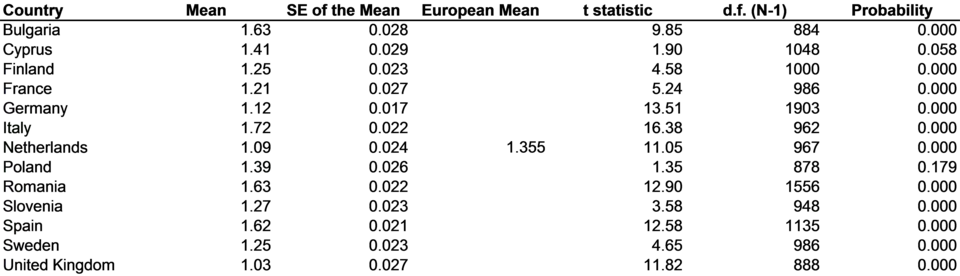 10.1. Comparing group differences using mean models The natural way to think of group differences in the values of a variable is to think of each group as having a mean of its own. For example, in Figure 10-1 each of the thirteen countries has its own mean level of confidence in the EU. The 885 Bulgarians have a mean of 1.63, the 1,049 Cypriots have a mean 1.41, and so on down the list. This is the way people usually look at group means, and it is very intuitive. The problem with this approach is that it isn't necessarily an accurate reflection of reality. In reality, individual Europeans report more or less confidence in the EU for a variety of reasons. One of those reasons is the country in which a person lives. Another might be the person's age. More potential reasons include the person's gender, the person's level of education, the person's income, and whether or not the person has ever received funding or other assistance directly from the EU. Confidence in the EU as reported on the WVS can even be attributed in part to whether or not it was a sunny day when the question was asked: people are more likely to rate things highly on a sunny day than on a cloudy day. For all these reasons, a more appropriate way to think about group means is to think of them as group differences in the values of a single variable. The simplest way to do this is using a mean model (Chapter 4). Applying this approach to the European data, there is an overall mean level of confidence in the EU for all Europeans. People's actually reported levels of confidence at any particular time differ from this true mean for a wide variety of reasons. One of those reasons is their country of residence. The mean level of confidence in the EU for each country depends on the specific history and circumstances of that country. Mean models can be used to evaluate whether or not the true means for each country are significantly different from the overall mean level of confidence in the EU for all Europeans. In Chapter 6 we learned how to use the t statistic to evaluate the probability that a true mean might be zero. We can just as easily evaluate the probability that a true mean might be any number. In this situation, we want to know the probability that the true mean level of confidence in the EU in each country might be equal to the overall European mean. The observed mean across all European WVS respondents (14,154 individuals divided into 13 countries) was 1.355. Using the means for each country and their standard errors, t statistics can be calculated to evaluate how far each one is from the European mean. These t statistics and their associated probability levels are reported in Figure 10-2.