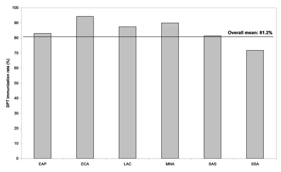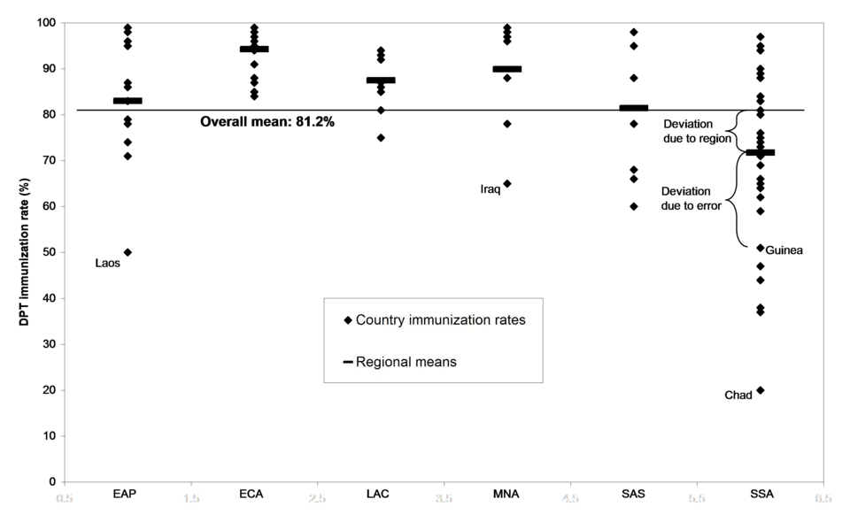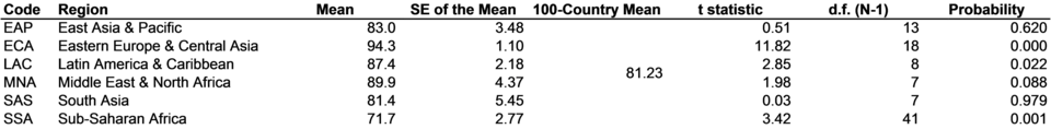 The mean model approach that was can be used to study cross-regional differences in DPT immunization rates. In the DPT example, the cases are countries and the countries are grouped into regions. In Figure 10-4, regional deviations from the overall 100-country mean of 81.23% are evaluated using t statistics. Of the six World Bank regions, two (ECA and LAC) have DPT immunization rates that are significantly higher than the 100-country mean, one (SSA) has a DPT immunization rate that is significantly lower than the 100-country mean, and three (EAP, MNA, and SAS) have DPT immunization rates that are not significantly different from the 100-country mean.