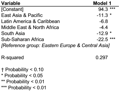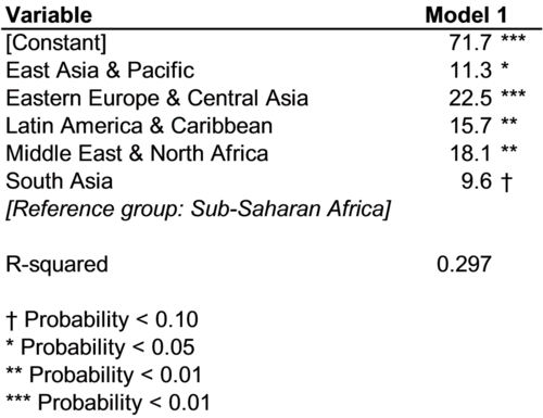 The coefficients in Model 1 of Figure 10-5 can be read just like those of any other regression model. When all five independent variables equal "0," the expected value of the DPT immunization rate is 71.7% (the constant). What does this mean? It means that 71.7% is the conditional mean rate of DPT immunization in Sub-Saharan Africa. In a straightforward ANOVA model like this, the constant gives the conditional mean value of the dependent variable for the reference group. This is no different from a simple regression model like that reported in Figure 4-6, where the constant represented the mean income for women (since for women, the value of the variable "Male" was 0). In Figure 10-5, Sub-Saharan African countries have the value 0 on all five ANOVA variables. As a result, their expected DPT immunization rates are: 71.7 + 11.3 x 0 + 22.5 x 0 + 15.7 x 0 + 18.1 x 0 + 9.6 x 0 = 71.7%. You can confirm this by looking up Africa's mean rate of DPT immunization in Figure 10-4. The coefficients for the five ANOVA variables represent the difference in mean DPT immunization rates between Sub-Saharan Africa and each of the regions. For example, the expected DPT immunization rate for countries in the World Bank region of Latin America & Caribbean is: 71.7 + 11.3 x 0 + 22.5 x 0 + 15.7 x 1 + 18.1 x 0 + 9.6 x 0 = 87.4%. Again, you can confirm this by looking it up in Figure 10-4. Since the actual regression coefficients in an ANOVA model represent differences from the reference group, different reference groups will yield different results. In Figure 10-5, all the coefficients are positive because every World Bank region has a higher mean level of DPT immunization than Sub-Saharan Africa. By contrast, every World Bank region has a lower mean level of DPT immunization than Eastern Europe & Central Asia. In an identical ANOVA using Eastern Europe and Central Asia as the reference group, all the coefficients would be negative. This is illustrated in Figure 10-6. In Figure 10-6, the R2 is the same as in Figure 10-5, but all the coefficients (including the constant) have changed.