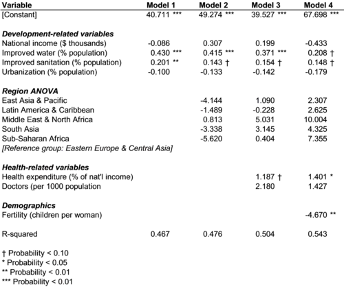 10.3. Mixed models ANOVA models are just regression models with a very particular setup of independent variables. Once appropriate ANOVA variables have been created to represent a categorical variable, they can be used in other regression models as well. For example, Figure 9-6 presented a series of seven regression models that used seven different variables to explain cross-national differences in DPT immunization rates. In Figure 10-7, these variables are combined with World Bank region into a single analysis that includes models that mix ANOVA variables with numerical variables. Mixed models are regression models that include both ANOVA components and ordinary independent variables. Like the coefficients of ANOVA models, the coefficients of mixed models are just ordinary regression coefficients and are interpreted the same way as any other regression coefficients.