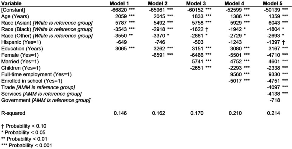 Industry in Figure 10-8 is operationalized as a categorical variable taking four possible values: AMM -- Agriculture, mining, and manufacturing Trade -- Wholesale and retail trade Services -- Education, healthcare, financial, and other services Government -- Federal, state, and local government, plus non-profit organizations The highest-paid group, AMM, has been used as the reference group. The coefficients reported in Model 5 indicate that (after controlling for all other variables) people working in trade and services make significantly less than people working in AMM, while people working in government make slightly (not significantly) less. Controlling for industry has very little effect on the R2 of the models (R2 improves from 0.210 to 0.214, or 0.4%), but it has a big effect on the gender gap. In Model 4, the gender gap is $5,501. This means that even after controlling for age, race, ethnicity, education, marriage, children, employment status, and educational enrollment, twentysomething American women are still found to make $5,501 less than twentysomething American men. Even after all those controls have been taken into account, controlling for the industry in which a person is employed reduces the gender gap by a further $791 a year, to $4,710. This is a pretty substantial drop, considering that industry has been only very broadly accounted for (for example, education, health, and finance have all been lumped together in "services"). Better controlling for industry and occupation would likely reduce the gender gap further. On the other hand, the gender gap is still very substantial, amounting to over $4000 out of a typical wage of $20,000 or so a year. Ever after controlling for many competing explanations, the gender gap in wages for American twentysomethings is at least 20%, and probably larger.