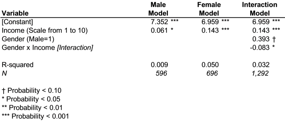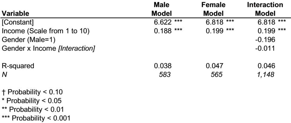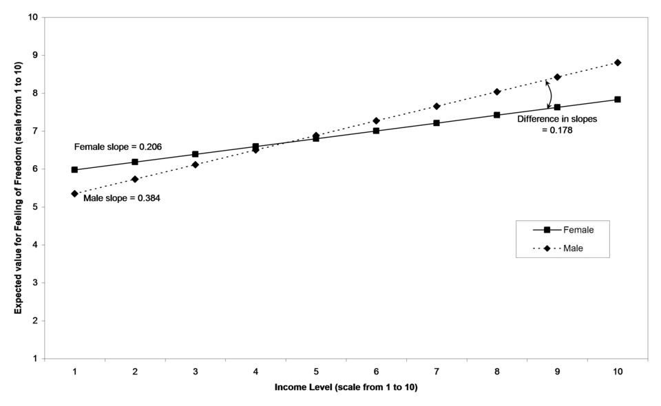 Interaction effects are not always significant. In fact, it can be difficult to find significant interactions. For example, in the United States the gender differences in the importance of income are not statistically significant. The results of freedom versus income regressions for the United States are reported in Figure 11-7. The slopes for both men and women are highly significant, but the interaction effect examining the difference in slopes is not.