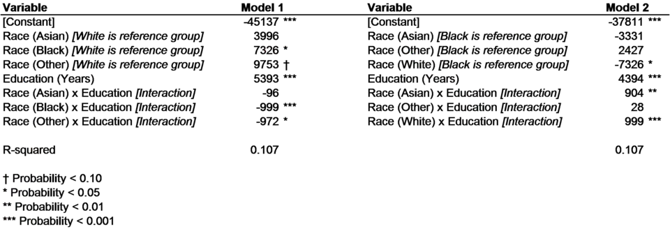 11.4. Multiple categorical interactions (optional/advanced) If a regression model can include multiple interactions for the same ANOVA variable (education and age by gender in Figure 11-9), it stands to reason that a regression model can include the same interaction for multiple ANOVA variables. In Figure 11-2 it was shown that the expected effects of education on wages were different for Americans of different races. The impacts ranged from a low of $4394 in extra wages per year of education for Black Americans aged 30 and over to a high of $5993 in extra wages per year of education for White Americans. Figure 11-10 shows how an interaction model can be used to examine the statistical significance of these interracial differences. Model 1 of Figure 11-10 includes three ANOVA variables for race (White is the reference group), the independent variable of interest (Education), and three interaction variables for Race x Education.