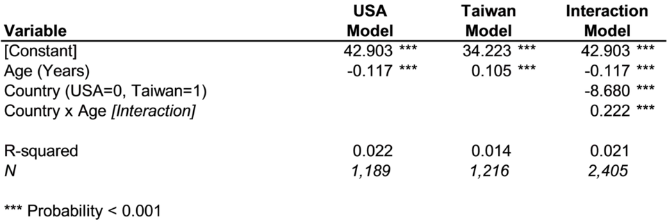 11.5. Case study: Cross-national comparison of democracy ratings In Chapter 5 it was argued that older people in Taiwan might rate the quality of Taiwan's democracy more highly because older Taiwanese had lived through a period of dictatorship before 1991. This might be called the "dictatorship theory" of democracy ratings. It was suggested in Chapter 5 that younger people who came of age in the democratic era might be more demanding, and as a result be less satisfied with Taiwan's democracy than older people. A regression model confirmed this reasoning. Taiwanese people's ratings of the democratic quality of their government was found to rise with age. The fact that Taiwanese people's ratings of Taiwanese democracy rise with age tends to support the dictatorship theory, but it doesn't prove the theory. An alternative theory, the "youth theory," might be that young people everywhere are more demanding when it comes to democracy, while older people are less demanding. One way to shed light on the relative merits of the two theories would be to compare the relationship between age and democracy ratings in Taiwan to those in another country. For this purpose, the United States has been chosen as a reference country, since the United States has never experienced a period of dictatorship. As a reminder, people's ratings of democracy have been scored on a scale from 0 to 100 where: Rating = 0 means the respondent thinks there is not enough democracy in her or his country Rating = 50 means the respondent thinks there is just the right amount of democracy in her or his country Rating = 100 means the respondent thinks there is too much democracy in her or his country The mean democracy rating (for all ages) was 38.7 in Taiwan and 37.2 in the United States. Regression models reporting the relationship between age and democracy ratings for the United States and Taiwan are reported in Figure 11-12. The Taiwan model is identical to that reported in Figure 5-7, except that now we have significance levels and an R2 to work with in addition to just the coefficients. The increase in democracy ratings with age is, in fact, highly statistically significant. The United States model, on the other hand, shows that democracy ratings decline with age in the United States. The decline with age in the US is even stronger than the rise with age in Taiwan. This seems to support the dictatorship theory over the youth theory of democracy ratings.