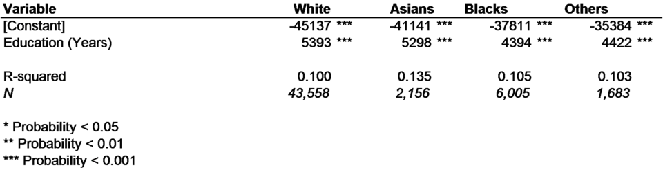 These differences between races are highly significant, but together they explain only a small proportion (juat half a percent) of the total variability in Americans' wages. This doesn't mean that race is unimportant. Around 80% of the American population identifies itself as White (including White Hispanics, such as most Mexican Americans). Since most of the population is White, most of the variability in people's wages is variability among White people. In other words, it is only possible for race to matter for the 20% of the population that is not White (considering White to be the reference group). Even for those people, other factors (like age, education, occupation, industry, place of residence, and employment) may matter more. So it's not surprising that race on its own explains only 0.5% of the total variability in people's wages. The large and significant coefficients in Model 1 indicate that race is important. Since we know from Figure 10-11 that levels of education differ significantly across races in the United States, we might hypothesize that the racial differences in wages observed in Model 1 of Figure 11-1 are due to racial differences in education. After all, if Blacks receive significantly less schooling than Whites, it would not be surprising to find that (on average) they earn lower wages. To investigate this possibility, Model 2 of Figure 11-1 controls for education. Since race is a categorical variable and education is a numerical variable, Model 2 is a mixed model. In Model 2, controlling for education reduces the racial gaps in wage income, but the remaining gaps are still highly significant. Model 2 indicates that Black Americans aged 30 and over and earn (on average) $5,810 less than white Americans of similar education levels. The affect of an additional year of education in Model 2 ($5,269) is almost as large as the wage gap between Blacks and Whites ($5,810). This suggests that one way to address racial differences in wages might be to encourage higher levels of education for Blacks. Right now, Blacks receive on average 0.556 fewer years of schooling than Whites (Model 1 of Figure 10-11). Might raising Black educational levels also raise wages for Blacks? Based on Model 2 of Figure 11-1, the answer seems like it might be yes. On the other hand, it is possible that an additional year of education will raise wages less for Blacks than for Whites. If this happens, it would be very difficult to use education to address the racial gap in wages. Figure 11-2 illustrates the differences between races in the effects of an additional year of education. For Whites, every additional year of education is associated with an increase of $5,393 in wage income. For Asians, the effect is similar, but slightly smaller ($5,298). For Blacks and Others, the economic impact of each additional year of education is much smaller. Black Americans earn on average an additional $4,394 in wage income for each additional year of education, while others earn an additional $4,422 for each year of education.