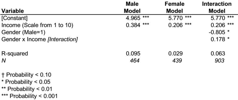 11.1. Interaction variables Does money set you free? That is to say, does having more money make people feel a greater sense of freedom in life? Not surprisingly, it does. In every country of the world for which data are available, there is a positive correlation between people's sense of personal freedom and their levels of income, though in some countries the relationship is not statistically significant. In the World Values Survey (WVS), personal freedom is measured using the question "How much freedom do you feel?" for which respondents circle a number ranging from 1 "none at all to 10 "a great deal." Mean levels of personal freedom across countries generally run around 7-8 on the scale from 1 to 10, with the poorest people in each country reporting scores that are 1-3 points less than the richest people. Clearly, income matters for people's feelings of freedom, but does it matter the same for all people? In particular, might income matter more for men than for women (or vice versa?). One country where income matters a great deal is Poland. Poland has one of the strongest correlations between income and feelings of freedom anywhere in the world (r = 0.239). Regression models for the impact of income on freedom for men and women in Poland are reported in the first two columns of Figure 11-3. Income is measured by breaking the population up into deciles on a scale from 1 (lowest income) to 10 (highest income). For every one point increase in income, Polish men's freedom ratings rise 0.384 points, while for the same increase in income Polish women's freedom ratings rise just 0.206 points. In Poland, money matters more to men than it does to women.