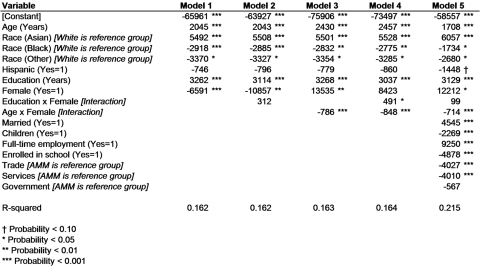 11.3. Interaction effects in mixed models with control variables The results reported in Figure 11-2 showed that every additional year of education raises wages for Whites more than it does for Asians, Blacks, and Others. If education has a different impact on wages for people of different races, might is also have a different impact on wages for people of different genders? In Figure 10-8 it was shown that every extra year of education results in over $3000 more in expected wages for twentysomething Americans. The main results of Figure 10-8 are reprinted as Model 1 in Figure 11-9. Figure 11-9 uses the same 2008 SIPP Wave 2 data to regress wage income on a number of predictors, including gender (coded as 0 for men and 1 for women). Model 1 of Figure 11-9 shows that twentysomething American women earn, on average, $6,591 less than twentysomething American men (after controlling for age, rage, Hispanic status, and education).