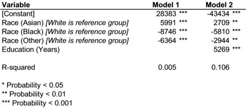 It is often said that education is the key to a better life. Education makes people more intelligent and better-informed. Education opens up people's minds to new ideas, new experiences, and new opportunities. Education even leads to better health. Education has all these effects because education changes people's very identities. Because you pursued higher education, you are a different person than you would have been. You may not like to admit that attendance at a college or university is changing you, but for better or worse it is. It is impossible to spend several years of your life studying and socializing in an academic setting without being affected in any way. For most people, education leads to a fuller, happier, longer life. Education is also closely associated with income. The education people complete early in life is highly correlated with the wages they earn years later. This is true all over the world, in rich countries and poor countries alike. There are many reasons why more educated people earn higher wages than less educated people. First of all, people who have rich and highly educated parents and tend to receive more education themselves, so more-educated people often start out with more advantages then less-educated people. More importantly, educational credentials are required for admission to many careers, ranging from massage therapists to cancer doctors and everything in between. Education also gives people knowledge and social contacts that help them in their careers. Whatever the reasons, the fact is clear: more highly educated people earn higher wages than less highly educated people. We saw this in Figure 10-8. Though Figure 10-8 focused mainly on the gender gap in wages, it also showed that every extra year of education results in over $3000 more in expected wages for twentysomething Americans. This figure was shown to be robust across all five models estimated. The coefficients for education in Figure 10-8 ranged from a low of 3065 in Model 1 to a high of 3262 in Model 2, with the coefficients for the other models falling somewhere in between these two figures. A coefficient over 3000 means that a four-year college degree is worth more than $12,000 a year in extra wages ($3000 per year x 4 years) to a typical twentysomething American. Unfortunately, as we learned in Figure 10-10 and Figure 10-11, education in America depends strongly on race. This is true in other countries as well, but more detailed data on the subject are available for the United States than for any other country. Among Americans aged 30 and over, Asians are the most educated, followed by Whites, then Blacks, then Others. Model 1 of Figure 10-11 showed that Asians complete on average 0.632 more years of schooling than Whites, while Blacks complete 0.556 fewer years of schooling than Whites. Racial differences overall explain less than 1% of the differences in education between individuals (R2 = .008), but the effects of race are nonetheless statistically significant and substantively important. Figure 11-1 explores the role played by education in explaining racial differences in wage income for Americans aged 30 and over. Data come from the 2008 Survey of Income and Program Participation (SIPP), Wave 2. Model 1 of Figure 11-1 is a straightforward ANOVA model in which wages are regressed on race. The categorical variable "race" has been operationalized using three ANOVA variables: Asian, Black, and Other. The reference group is White. The coefficients for Asian, Black, and Other represent the mean wage differences between people of these races and Whites. The difference is especially large for Blacks. On average, Black Americans aged 30 and over earn $8,746 less than White Americans. Asian Americans earn (on average) $5,991 more than Whites. Combining these two figures, Asian Americans earn (on average) 5991 + 8746 = $14,737 more than Black Americans.