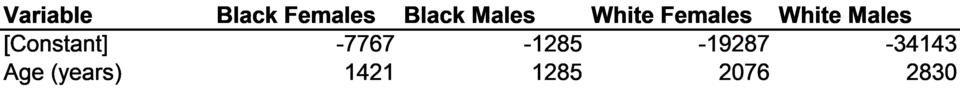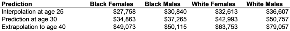 The slopes of the regression models reported in Figure 3-10 contrast the effects of an extra year of age on peoples' wage incomes for different groups of people. For black women, every additional year age yields, on average, an extra $1421 of wage income. Black men don't get quite as much advantage from getting a year older, just $1281. The big difference comes with white women and men. For white women, each year of age yields on average an extra $2076 of wage income. The benefits of age for white men are even greater. For white men, every year of age yields on average an extra $2830 of wage income. The expected payoff of an extra year's age for a white man is nearly twice as high as the average payoff for a black woman. The coefficients of the for regression models reported in Figure 3-10 can be used to calculate predicted values for the wage incomes of black females, black males, white females, and white males at any given age. From Figure 3-10, the regression model for black women was Wage income = -7767 + 1421 x Age. For black women of various ages, this works out to: Age 25: Wage income = -7767 + 1421 x 25 =$27,758 Age 30: Wage income = -7767 + 1421 x 30 =$34,863 Age 40: Wage income = -7767 + 1421 x 40 =$49,073 These figures are reported in Figure 3-11 in the column for black females. Figures for black men, white women, and white men are calculated in the same way. The prediction of wage income at age 25 for each group is an interpolation, since the ages of the SIPP participants in the study were 20-29. As an interpolation, it should be a pretty accurate estimate of the incomes of 25-year-olds in each category would be expected to earn. The prediction of wage income at age 30 is on the very edge between an interpolation and an extrapolation, so it might be less reliable. The prediction of wage income at age 40 is an extrapolation far out into the future, so far that most social scientists would not trust it at all. The age 40 extrapolation is included here just to illustrate how extrapolation works.