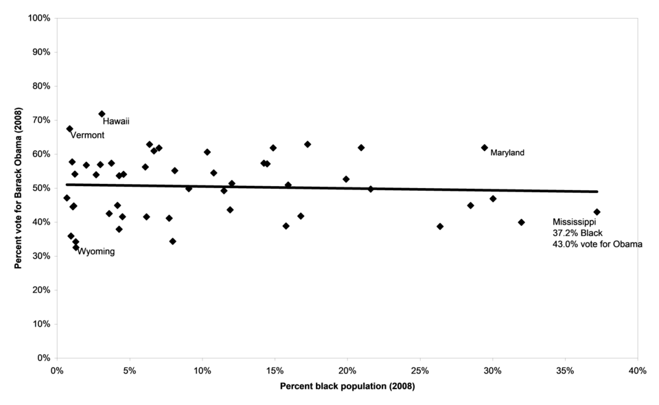 3.5. Case study: Predicting state election outcomes based on race On November 4, 2008, Barack Obama was elected the first black President of the United States. President Obama's father was Kenyan and Barack Obama himself grew up mainly in Hawaii, far from the historical center of American civil rights struggles. Nonetheless, like any black American Obama would have been affected by racial discrimination throughout his life. Both Obama and America overcame racial discrimination when Obama was elected President, but was his race a factor in his election? Regression models can help shed light on the role played by race in the 2008 election. Most of the time discrimination hurts a person, but sometimes it can also help a person. In the 2008 presidential election, black Americans voted overwhelmingly for Barack Obama. According to CNN news, exit polls on election night indicated that 96% of blacks voted for Obama. These votes certainly helped Obama win the election, but American elections aren't determined just by the number of people who vote for a candidate. They are determined by state electoral votes. In most states, whoever receives the most votes within the state gets all of that state's electoral votes. Thus, it is possible to win the most votes but still lose the election. This happened to Al Gore in 2000, when he won more people's votes than George Bush but fewer state electoral votes. In the 2008 election, Obama won both the most people's votes and the most state electoral votes, and so was elected President. Strangely, though, he lost the election in some of the states that have the highest black populations. For example, Mississippi has the highest percentage of blacks of any state in the United States (37.2% black), but Obama received only 43.0% of the vote in Mississippi and lost the state to his opponent, John McCain. The same thing happened in other heavily black states, like Alabama and Louisiana. The relationship between the percent of a state's population that is black and the percent of a state's voters who voted for Obama is plotted in Figure 3-12. It turns out that there was almost no relationship between a state's black population and its presidential vote in 2008. The slope of the regression line is actually slightly negative. This means that states with higher black populations tended to vote slightly less for Obama. The highest vote for Obama was in the state where he grew up, Hawaii (71.9%). The very lowest vote for Obama was in the historically Republican western states of Wyoming (32.5%).