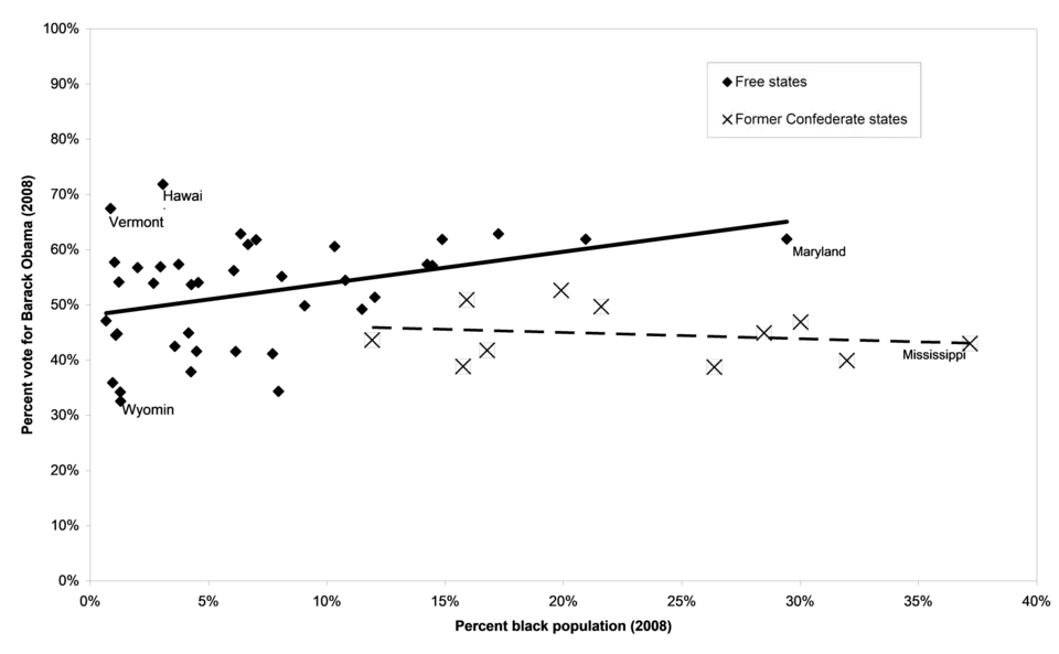 How is it possible that there was no relationship between the number of blacks in a state and the vote for Obama in that state, given that 96% of black Americans voted for Barack Obama? The answer is that in many states with large numbers of blacks, whites voted overwhelmingly for his opponent, John McCain. This trend was particularly pronounced in the South. The historical center of the struggle for civil rights for black Americans has always been the South, in particular the 11 states of the former Confederacy that seceded from the United States during the Civil War (1861-1865). The 11 Confederate states were strongly committed to continuing the institution of slavery, and after being readmitted to the Union they put in place policies and laws that discriminated heavily against their black citizens. Black Americans have suffered discrimination everywhere in the United States, but the levels of discrimination in the 11 former Confederate states have historically been much worse than elsewhere. Figure 3-13 plots exactly the same data as Figure 3-12, but divides the states into the 39 "free" states that were never part of the Confederacy versus the 11 former Confederate states that seceded from the United States during the Civil War. The free states are marked with diamonds and the former Confederate states are marked with X's. Separate regression lines have been plotted for the two groups of states. Among the 39 free states, states with higher black populations returned higher votes for Obama, as would be expected. Among the 11 former Confederate states, states with higher black populations actually returned lower votes for Obama.