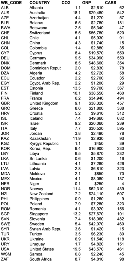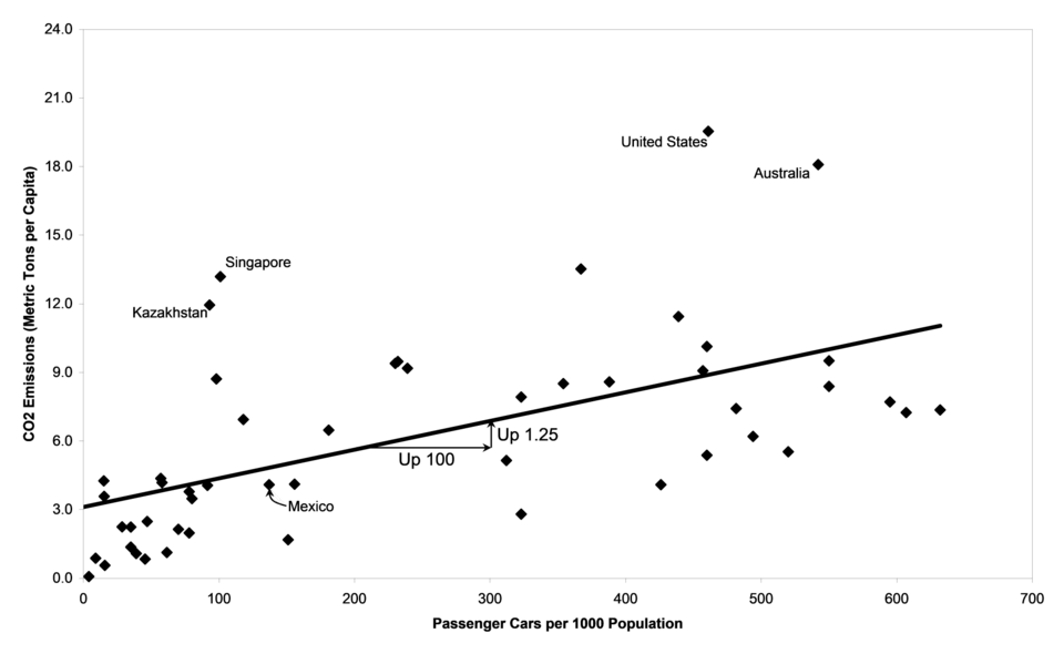 Two outliers in Figure 3-2 are the United States and Australia. Both have much higher carbon emissions than would be expected based on their numbers of cars. For the United States, this disconnect has a simple explanation: many Americans don't drive cars. They drive trucks and SUVs. These vehicles aren't included in the World Bank's "passenger cars" figures, but they certainly burn gasoline and produce carbon dioxide -- lots of it. For Australia, the explanation is more complicated, but Australia's high levels of carbon dioxide emissions are partly due to a heavy reliance on coal for electricity generation. Other countries that deviate from their expected levels of carbon emissions (Singapore, Kazakhstan) have their own stories. Overall, though, when countries have more cars they're likely to emit more carbon dioxide. This result is robust: removing Australia, the United States, Singapore, or Kazakhstan has little effect on the slope of the regression line.