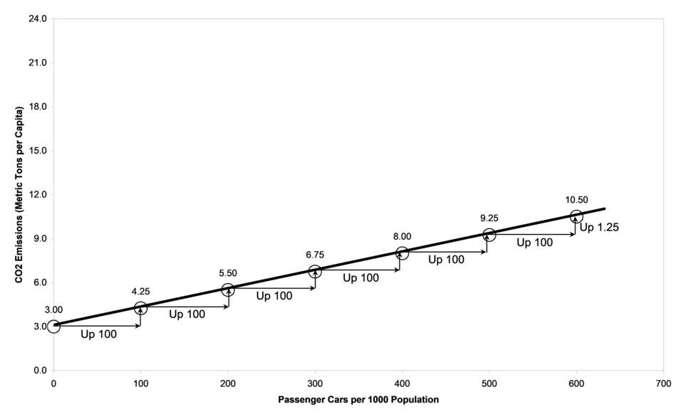One interesting feature of Figure 3-2 is the expected value of carbon dioxide emissions when there are no cars in a country. This can be determined by finding zero on the passenger cars axis and reading up the graph until you hit the regression line. According to the regression line, when the number of cars is zero the expected level of carbon emissions is around 3 tons per capita. This implies that even if we gave up driving entirely, we would still have a problem with global warming. The reason is that there are many other sources of carbon emissions besides cars. We burn coal in power plants to generate electricity. We burn natural gas to heat our homes. Even without cars we would still have ships, trains, and airplanes burning oil. Solving global warming is going to be very difficult.