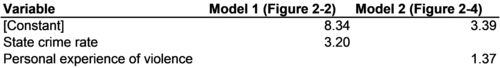 The slope associated with the independent variable "Cars" (0.0125) is listed next to the entry for "Cars." If there were more independent variables, they would be listed in additional rows. Similarly, if there were more regression models, they would be listed in additional columns. Regression tables are especially convenient for reporting the results of several regression models at the same time. In Chapter 2, the percent of Australians who felt unsafe walking alone at night was regressed on state crime rates (Figure 2-2) and personal experiences of violence (Figure 2-4). Instead of using scatter plots, the results of these two regression analyses can be summarized compactly in a single table, as shown in Figure 3-5. All of the coefficients associated with both models are reported in this one table.