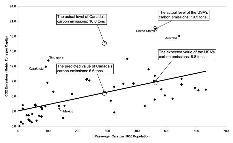 Another use of regression coefficients is to predict levels of the dependent variable for cases that were not included in the regression analysis. Predicted values are expected values of a dependent variable that correspond to selected values of the independent variable. In other words, we can use the equation of a regression line to make predictions. For example, Canada was not included in the carbon dioxide analyses in this chapter because the WDI database (Figure 3-1) was missing passenger car data for Canada. Even though passenger car data for Canada are not available from the WDI, they are available from the Canadian government. According to official Canadian government statistics, there were 290 passenger cars per 1000 people in Canada in 2005. This figure is so low because like Americans almost half of all Canadians drive trucks and SUVs instead of cars. The equation of the regression line for carbon dioxide emissions says that expected carbon dioxide emissions = 3.00 + 0.0125 x passenger cars (Figure 3-6). Using the Canadian government data for passenger cars in Canada, 3.00 + 0.0125 x 290 = 6.625, which rounds off to about 6.6 tons. The actual value for carbon emissions for Canada was 16.6 tons. These figures are graphed in Figure 3-7. Like the United States, Canada has much higher carbon emissions than would be expected based on the regression model.