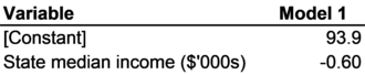 Figure 3-8 reports the results of a regression model with state median income as the independent variable and state per capita soft drink consumption as the dependent variable. The regression line in this model has an intercept of 93.9 and a slope of -0.60. This means that every $1000 of additional income is associated with a decline of 0.60 gallons in the amount of soft drinks consumed. This regression line is the line that appears on the scatter plot in Figure 1-2. The equation for this line is Soft drink consumption = 93.9 - 0.60 x State median income in thousands of dollars.
