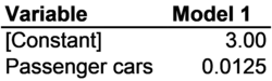Tables of regression coefficients that include slopes and intercepts can also be used to compute the expected values. This should not be surprising, since slopes and intercepts are used to plot regression lines and expected values are just the values on the regression line. Returning to the relationship between passenger cars and carbon dioxide emissions, the slope is 0.0125 and the intercept is 3.00 (Figure 3-4). The slope and intercept define the regression line: the line starts at 3.00 tons of carbon emissions when the number of cars equals 0, then goes up by 0.0125 tons for every 1 additional car. An increase of 0.0125 for every car is the same as 125 for every 100 cars (Figure 3-5). As shown in Figure 3-3, the expected value of carbon emissions for 0 cars is 3.00 tons. For 100 cars the expected value is 4.25 tons. For 200 cars it is 5.50 tons. And so on.