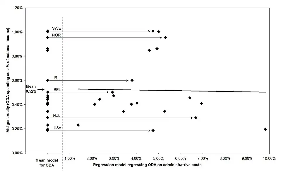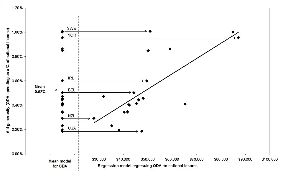 6.3. Inferences about regression slopes In regression models, the t statistic is used to make inferences about the true slope. The t statistic can also be used to make inferences about regression intercepts, but this is rarely done in practice. While inferences about true means are only made in special situations (like with paired samples), inferences about true slopes are made all the time. It's so common to use t statistics with regression slopes that statistical software programs usually print out t statistics and their associated probabilities by default whenever you use them to estimate a regression model. In writing up statistical results in the social sciences, almost any regression slope is accompanied by a note reporting its statistical significance. Returning to the example of official development assistance (ODA) spending as a proportion of national income for 20 rich countries, a mean model for ODA spending is depicted on the left side of Figure 6-8. The observed mean level of ODA spending for the 20 rich countries is 0.52% (as noted on the chart), but individual countries deviate widely from this mean. Sweden (SWE) gives almost twice the mean level (1.01% of national income) while the United States (USA) gives much less than half the mean level (0.19% of national income). What makes some rich countries more generous than other countries in helping poor countries with ODA aid?