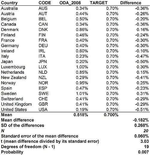 6.4. One-sample t statistics (optional/advanced) The t statistic associated with a parameter is usually used to make inferences about whether or not a true parameter is significantly different from 0. By default, this is how all statistical software programs are programmed to use the t statistic. Nonetheless, sometimes social scientists want to make other inferences about true parameters. It takes some extra work, but is it possible to use t statistics to evaluate whether or not true parameters are significantly different from any number, not just 0. This is most commonly done in mean models. In regression models, we almost always want to know whether or not the line truly slopes, and nothing else. In mean models, on the other hand, we often want to know whether or not the true mean hits some target or threshold. This can be illustrated once again using the data on ODA spending levels. The observed mean level of ODA spending across the 20 rich countries listed in Figure 4-1 is 0.52%. As discussed in Chapter 5, these countries agreed a target level for ODA spending of 0.70% of national income. The standard error of ODA spending was used in Chapter 5 to argue that it is "very unlikely" that the true mean level of ODA spending met the target of 0.70%. Just how unlikely is it? One way to answer this question would be to construct an artificial paired sample database. Each country's actual level of ODA spending could be paired with the target level of 0.70% and the difference calculated. This is done in Figure 6-11. The t statistic for the mean difference between actual and target ODA spending is 3.03 with 19 degrees of freedom. The probability associated with this t statistic is just 0.007 (0.7%). In other words, there is only a 0.7% chance that countries are truly meeting their target of spending 0.7% of national income on ODA (the fact that both figures are 0.7 is just a coincidence). The true mean spending level falls significantly short of the 0.7% target.