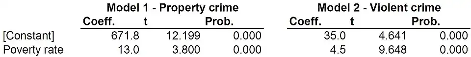 The two t statistics, on the other hand, are comparable. The t statistics represent the statistical significance of each relationship. Put differently, the t statistics are related to how much of the county-specific deviation from the mean crime rate is captured by the regression models for property crime and for violent crime. The t statistic for violent crime is about 2.5 times as large as the t statistic for property crime. This implies that poverty explains much more of the variability in violent crime rates than the variability in property crime rates. In other words, poverty is more important for understanding violent crime than for understanding property crime. This tends to lend more support to the psychosocial theory of poverty than to the materialist theory of poverty. Poverty is not just a matter of money. It is also -- or maybe even more so -- a matter of dignity.