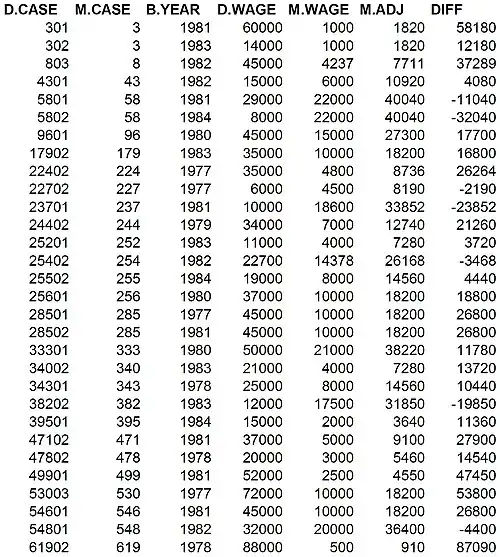 One of the biggest changes in society over the past fifty years has been the expansion of economic rights for women. More women have jobs outside the home than ever before, and women are able to work in a wider variety of jobs than ever before. Women still face many challenges including discrimination in the workplace, but high-paying jobs are no longer reserved just for men. Opportunities are becoming more equal. It is not so long ago that many careers were closed to women. The women who made up the original survey sample for the US National Longitudinal Survey of Youth (NLSY) were born in the years 1957-1964. These women started their careers in the early 1980s, at a time when most professions were open to women but serious wage discrimination still existed. In many cases these women were also expected to put childcare responsibilities ahead of career development. Today, as these women near retirement, the discrimination they faced over the decades probably means that they are still making less money than the should be given their knowledge and experience. They suffered a lifetime of challenges that helped open opportunities for the women of the future. The daughters of these women were mainly born in the 1980s They entered the labor market in the 2000s. These women are experiencing much less wage discrimination than their mothers did. As a result, we might hypothesize that the daughters of the original NLSY women would earn higher wages than their mothers did before them. A database comparing NLSY daughters' wages to their mothers' wages is illustrated in Figure 6-1. Daughters' wages are taken from the 2008 NLSY and pertain to wages earned in the calendar year 2007. Only daughters who were approximately 23-30 years old at this time are included. Mothers' wages are taken from the 1988 NLSY and pertain to calendar year 1987, when they were also 23-30 years old. The mothers' wages have been adjusted for inflation. Only daughters and mothers who reported having wage income are included in the database (those with no income or missing income are excluded). The first 30 rows of the database are shown in Figure 6-1, but the full database contains a total of 642 daughter-mother pairs. The database includes 7 columns. The first two are metadata items: the daughters' and mothers' case identification numbers. The five variables included in the database are: B.YEAR -- the year of the daughter's birth D.WAGE -- the daughter's wage income in 2007 M.WAGE -- the mother's wage income in 1987 M.ADJ -- the mother's wage income adjusted for inflation to 2007 dollars DIFF -- the difference between each daughter's wage income and her mother's wage income, or how much more the daughter makes than the mother did