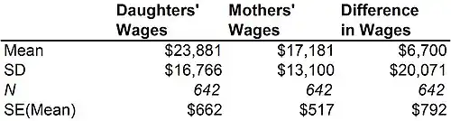Descriptive statistics for the daughters' wages and their mothers' wages (adjusted for inflation) are reported in Figure 6-2. The observed mean of the daughters' wages ($23,881) is much higher than the observed mean of their mothers' wages ($17,181). This suggests that there has been real generational change in women's employment opportunities.