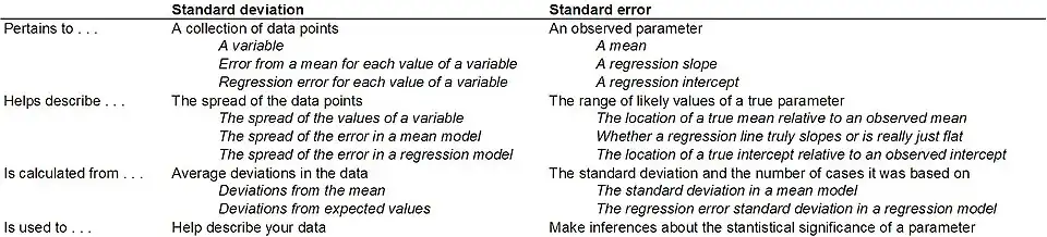 6.1. The t statistic Standard errors are a lot like standard deviations. Every variable has a mean and a standard deviation. Standard deviations are meaningful because in the majority of cases the value of a variable falls within one standard deviation either direction of its mean. In nearly all cases the value of a variable falls within two standard deviations either direction of its mean. Any case that falls more than two standard deviations away from the mean is exceptional and likely to be an outlier. On the other hand, parameters like means, slopes, and intercepts have standard errors. Most of the time the true parameter of a model falls within one standard error of the observed parameter. The true parameter is almost always within two standard errors of the observed parameter. Standard errors, however, also have one more very important property. It is possible to prove mathematically that true parameters differ from observed parameters with an exact probability that can be calculated from the standard error of the parameter. The main difference between a standard deviation and a standard error is that a standard deviation describes a collection of data points (like a variable) while a standard error describes an observed parameter (like a mean, slope, or intercept). Standard errors represent the amount of error in the observed parameters. Standard deviations are used to calculate standard errors, but standard errors are much smaller than standard deviations. The key differences between standard deviations and standard errors and how they are used are summarized in Figure 6-3.