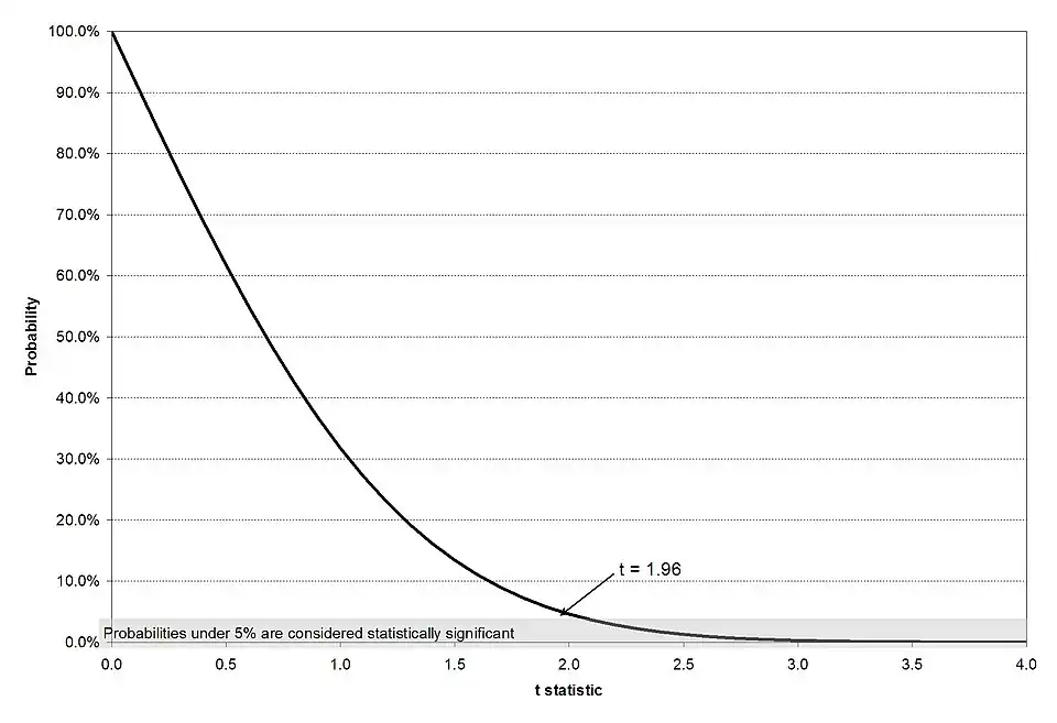 In inferential statistics standard errors are used to make inferences about the true values of parameters. For example, we often want to know the value of a true mean. We know the values of observed means of variables, and we know that the true means of variables are probably close to their observed means, but never know for certain exactly what the true means are. The standard error of the observed mean of a variable helps us make inferences about the probably value of its true mean. In Figure 6-2, it's very important (from a social policy perspective) to know whether or not the true mean of the daughter-mother difference in wages in wages might be zero. If the true mean were zero, that would mean that women were making no progress at all in fighting discrimination in the workplace. The observed mean difference in wages is $6700 with a standard error of $792. Another way of saying this is that the observed mean is 8.46 standard errors away from 0. If you started at $6700 and subtracted one standard error, you'd get $5908. If you went down a second standard error, you'd get to $5116. If you went down a third standard error, you'd get to $4324. You'd have to go down 8.46 standard errors to get to $0. If the true mean difference in wages really were $0, the observed mean would be off by 8.46 standard errors. Statisticians call this ratio of an observed parameter to its standard error the "t" statistic. t statistics are measures based on observed parameters that are used to make specific inferences about the probabilities of true parameters. The label "t" doesn't actually stand for anything. By an accident of history, the person who first calculated the t statistic in 1908 had used "s" to represent the standard deviation and "t" just happened to be the next letter of the alphabet. The t statistic is a measure of how big a parameter is relative to its standard error. The t statistic of a parameter can be calculated very easily by dividing a parameter by its standard error, but it's usually unnecessary to do the calculation yourself. Statistical software programs routinely report t statistics alongside parameters and their standard errors. The t statistic measures the size of a parameter. When an observed parameter has a large t statistic, we can infer that the true parameter is significantly different from 0. For example, a t statistic of 10 means that a parameter is 10 times as large as its standard error and is thus 10 standard errors away from 0. This is a large and significant difference. Statistical significance is when a statistical result is so large that is unlikely to have occurred just by chance. An observed parameter that has a t statistic larger than 2 is usually statistically significantly different from 0. In the NLSY women's wages example (Figure 6-2), the t statistic for the observed mean of the daughter-mother difference in wages is 8.46. This is much bigger than 2. We can infer that the true mean daughter-mother difference in wages is very significantly different from $0. Statistical computer programs can tell us exactly how statistically significant this result is. Statistical software can be used to calculate the exact probability of finding a t statistic of any given size. This probability is based on the numbers of degrees of freedom in a model. For example, the mean model for the daughter-mother wage gap in Figure 6-2 is based on 642 cases. Since the mean model uses 1 parameter, the model has 642 - 1 = 641 degrees of freedom. A computer program can tell us that when the t statistic of an observed mean is 8.46 with 641 degrees of freedom, the probability that the true mean could be something like $0 is 0.000000000000018%. In other words, the true mean is certainly not $0. Technically, what the probability of the t statistic tells us is that "the probability that the true mean could be 8.46 or more standard errors in either direction away from the observed mean of $6700 is 0.000000000000018%." So technically, this probability is the probability that the true mean could be $0, less than $0, $13400, or greater than $13400. The practice in some disciplines (like psychology) is to break out these probabilities into different "tests" and perform "1-tailed" and "2-tailed" analyses. In the social sciences, the usual practice is much more straightforward. The probability of the t statistic is simply considered to be the probability that the parameter is significantly different from 0. Figure 6-4 gives some idea of how big a t statistic has to be to be considered statistically significant. Figure 6-4 reports the probability associated with a t statistic with 641 degrees of freedom (as in the daughter-mother wage example). The actually observed t statistic of 8.46 is off the chart. Social scientists usually consider a t statistic to be statistically significant if it is associated with a probability of 5% or less. So when an observed mean is so large (relative to its standard error) that the probability that the true mean could be 0 is under 5%, we proclaim the true mean to be statistically significantly different from 0.
