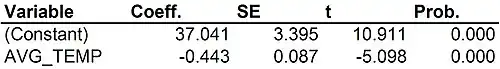 For a mean model with 641 degrees of freedom, any t statistic greater than about 1.96 indicates that the true mean is significantly different from 0. As with other statistics, there's usually no need to calculate any of this. Statistical software programs can provide all the necessary information. For example, statistical software output reporting the results of a regression of smoking rates on temperature in Canadian provinces (Figure 4-9) would usually look something the table in Figure 6-5. While it is helpful to be able to understand the standard errors and t statistics, all you really need from the table is the probability. In the example of the Canadian provincial smoking rates, both the intercept (37.041) and the slope (-.443) for the effect of temperature on smoking are statistically significant.