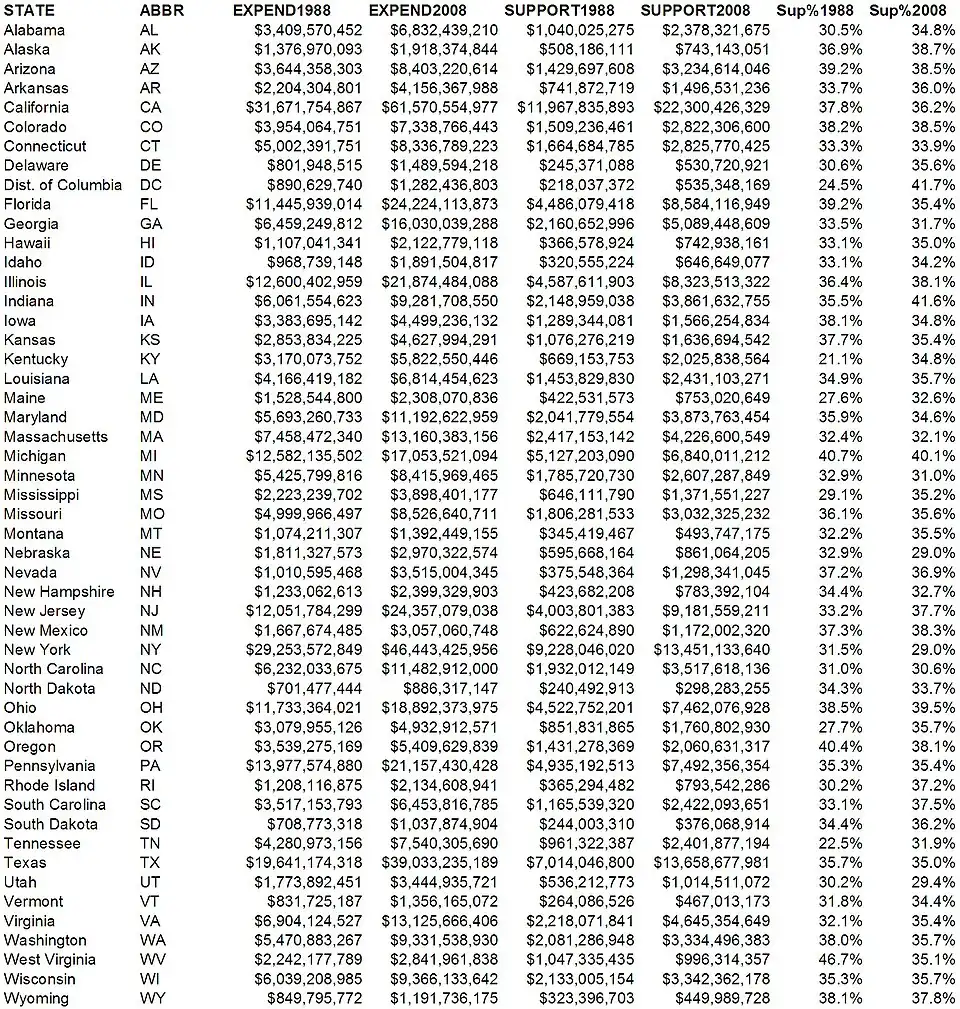 6.2. Inferences using the mean model In the mean model, the t statistic is used to make inferences about the level of the true mean, but we're usually not very interested in true means. Usually the observed means are good enough. For example, the observed means for daughters' and mothers' wages for the NLSY sample (Figure 6-2) are $23881 (daughters) and $17181 (mothers). The t statistic for daughters' wages is 36.1 and the t statistic for mothers' wages is 33.2 (both with 641 degrees of freedom). The very large t statistics tell us that the true means of both daughters' and mothers' wages are significantly different from $0. That's correct, but not very interesting. Of course their true wages are different from $0. Why would they work if their employers paid them $0? The t statistic is only really useful in mean models when there's some reason to demonstrate that the true mean couldn't be 0. This usually happens when pairs of linked cases are being compared, like when daughters' incomes are compared to their mothers' incomes. Paired samples are databases in which each case represents two linked observations. With paired samples, often what we want to know is whether or not the true mean of a variable has changed significantly from one time period to another. We know that the observed means have changed. If we survey 642 women in 1988, then survey their daughters twenty years later in 2008, it's almost impossible for the two means to be exactly the same. Just by chance one or the other will be higher. What we want to know is whether or not the mean twenty years later is significantly higher. With paired sample data, mean models are often used to make inferences about the true mean change over time. As with daughters' and mothers' incomes, there are often important social policy reasons for knowing whether or not change has occurred. For example, many people believe that schools today suffer because they spend too much time and money on social support services for children and families and not enough on education. There is a general impression in society today that schools now spend much more of their limited resources on student services instead of direct classroom instruction. Have schools really moved from a focus on education to a focus on social work? This is an ideal question for a mean model based on paired sample data. Figure 6-6 contains a database of school spending figures for the 50 US states plus the District of Columbia for 1988 and 2008. In addition to the usual metadata items there are six variables: EXPENDxxxx -- Total school expenditures in 1988 and 2008 SUPPORTxxxx -- Student support services expenditures in 1988 and 2008 Sup%xxxx -- Student support as a proportion of total expenditures in 1988 and 2008 Student support services expenditures include spending on school nursing, school psychology, counseling, and social work services. The 1988 figures have been adjusted for inflation to 2008 dollars. Note that all expenditures have risen in part because all state populations have increased since 1988 and in part because all states spend more on education per student than they did in 1988.