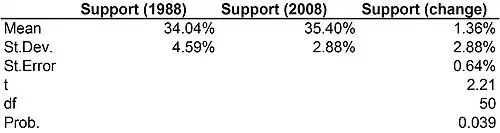 The observed mean change in student support spending was 1.36%. Observed state spending on student support services has in fact gone up. Does this mean that states are truly focusing more on student support services than they did in the past? Or is this rise more likely just random variation from a true mean of 0% (indicating no change)? The probability of the t statistic can be used to make inferences about the true mean change over time. The t statistic for the change in student support spending is 2.21 with 50 degrees of freedom (there are 51 cases, so the degrees of freedom are 51 - 1 = 50). The probability associated with this t statistic is 0.039, or 3.9%. In other words, there is only a 3.9% chance that the true mean change in student support spending between 1988 and 2008 was 0%. Since the chance that there was no change in the true mean is less than 5%, we can infer that the true mean level of student support spending has changed between 1988 and 2008. States spent a significantly higher proportion of their budgets on student support services in 2008 than they did in 1988. The mean proportion of education spending that goes to student support services has clearly increased since 1988. The observed mean increase was 1.36% and the t statistic confirms that this increase was statistically significant. Does this mean that it is important? After all, the mean level of student support spending only increased from 34.04% to 35.40% over a twenty year period. In 23 states is actually went declined. These seem like very weak results on which to base social policy. The increase is statistically significant, but is does not seem large enough to be meaningful from a policy standpoint. Substantive significance is when a statistical result is large enough to be meaningful in the view of the researcher and society at large. The increase in student support spending since 1988 is statistically significant, but it's probably not large enough to be considered substantively significant.