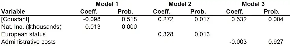 One theory to account for some of the case-specific error in the mean model might be that richer countries have more money to spend and so can afford to be more generous. There is wide variability among rich countries in just how rich they are. The poorest rich country is New Zealand (NZL) with national income of $27,940 per person, while the richest is Norway (NOR) with national income of $87,070 per person. The theory would suggest that Norway can afford to give much more in aid than New Zealand, and it does. Generalizing from these two cases, we might hypothesize that country ODA spending levels rise with national income levels. The right side of Figure 6-8 shows how ODA spending is related to national income levels. The hypothesis seems to be correct: a large part of the case-specific error in ODA spending can be attributed to differences in national income. From a descriptive standpoint, differences in national income account for a "large" amount of the case-specific error in ODA spending, but is the effect of national income statistically significant? Model 1 in Figure 6-9 reports the results of a regression of ODA spending on national income in thousands of dollars. The data for this and the other models reported in Figure 6-9 are taken from the database depicted in Figure 4-1. The slope for national income is 0.013, indicating that every $1000 increase in national income is associated with an expected increase of 0.13% in ODA spending. Based on the data we have, the probability that the true slope for national income might really be 0 is tiny. We can infer that the true slope for national income is almost certainly not 0. National income has a highly significant impact on ODA spending.