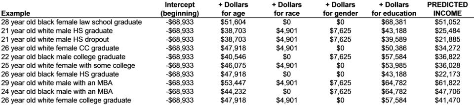 The calculations for predicted wage income levels for 10 American twentysomethings are illustrated in Figure 7-10. The values in the table illustrate how a single regression model (Figure 7-8) can produce a very wide variety of predictions. The predicted incomes range from $21,885 for a 21 year old white male high school dropout to $61,822 for a 29 year old white male with an MBA. Lower and higher incomes are also possible. For example, a 21 year old black female high school dropout would be expected to earn just $9,359 per year. This is below the US minimum wage for a full-time worker, but the SIPP data are based on all employed people, including part-time employees. As predicted by the regression model, a 21 year old high school dropout might have trouble finding a full-time job.