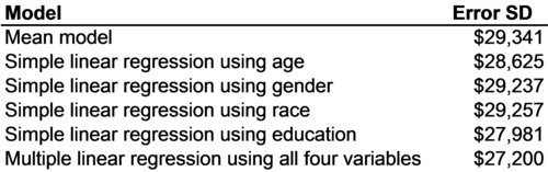 Of course, most people have incomes that are very different from their predicted values. How different? Figure 7-11 reports the model error standard deviation for six different ways of predicting people's incomes. In the mean model, each person's income is predicted using the observed mean income for all 4964 American twentysomethings in the sample. The four simple regression models each use a single independent variable to calculate predicted values for income, while the multiple regression model uses all four independent variables together. The error standard deviation is based on the deviation from their expected incomes in each model for all 4964 people. The multiple linear regression model has less model error than any of the other models, but not much less. Even knowing people's age, race, gender, and education, it is very difficult to predict their incomes with accuracy.