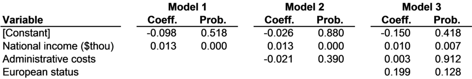 Controlling for European status reduces the slope for National income because the variable European status competes with the variable National income in explaining levels of ODA spending across rich countries. Competing controls are control variables that compete with an independent variable of interest by splitting its explanatory power in a multiple regression model. From the standpoint of National income, European status is a competing control. On the other hand, from the standpoint of European status, National income is a competing control. They both compete to explain the same fact, that rich European countries have higher ODA spending than other countries. This was illustrated in Figure 7-5. The fact that the coefficient for National income remains significant in Model 3 while the coefficient for European status is not significant suggests that National income is the stronger of the two predictors of ODA spending. Any independent variable in a multiple regression model can be thought of as a control variable from the perspective of other independent variables. Whether or not a variable should be thought of as a control variable is up to the judgment of the researcher. If a variable is used with the intent that it should be held constant in order to bring out the true effect of another variable, it is a control variable. If a variable is of interest in its own right, then it is not. From a purely statistical standpoint, every independent variable in a multiple regression model is a control variable for all the other variables in the model. From a social science standpoint, a variable is a control variable if the researcher thinks it is, and if not, not.