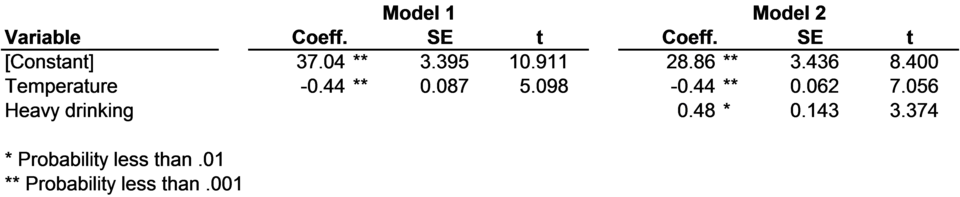 In Model 1, the standard error of the slope for Temperature is 0.087, but the standard error declines to 0.062 in Model 2. The smaller standard error in Model 2 results in a larger t statistic. In this example, the effect of Temperature on the smoking rate is already highly significant (the probability that the true slope for Temperature is 0 is less than 0.001), so the higher t statistic doesn't change our interpretation of the model. Nonetheless, the slope for Temperature is more statistically significant in Model 2 than it is in Model 1. Why does the standard error of the slope go down when a control variable is introduced? Heavy drinking is completely unrelated to Temperature, but it is related to the smoking rate. In fact, Heavy drinking accounts for an important part of the total variability in smoking rates. As a result, there is less model error in Model 2 than in Model 1. Standard error is a function of the strength of the relationship between the independent variable and the dependent variable, the number of cases used to estimate the model, and the amount of error in the model. From Model 1 to Model 2 the strength of the relationship hasn't changed (it's still -0.44), the number of cases hasn't changed (it's still 13), and the amount of model error has declined (due to the effect of Heavy drinking). The net effect is that the standard error associated with Temperature has declined. Temperature is an even more significant predictor of smoking after controlling for Heavy drinking than it was before.