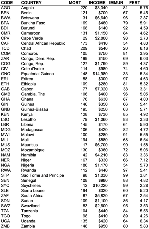 7.5. Case study: Child mortality in sub-Saharan Africa Out of every 1000 children born in Africa, only 850 live to their fifth birthdays. This mortality rate of 150 per 1000 children is shockingly high. By comparison, the child mortality rate in rich countries is typically around 5-6 per 1000 children. The United States has the highest child mortality rate in the developed world, with the loss of 7.7 out of 1000 children by age 5. Child mortality rates in African countries are typically 20 times as high. Child mortality and related statistics for 44 sub-Saharan African countries are reported in Figure 7-14. In addition to the metadata items, four variables are included: MORT -- The under-5 mortality rate per 1000 births INCOME -- National income per person in US Dollars FERT -- The fertility rate (mean births per woman of childbearing age) IMMUN -- The DPT (Diphtheria-Pertussis-Tetanus) childhood immunization rate A multicausal model of child mortality would predict that childhood mortality rates should decline with income (richer countries should have lower mortality), decline with immunization (countries with better immunization should have lower mortality), and rise with fertility (countries with more children should have higher mortality).