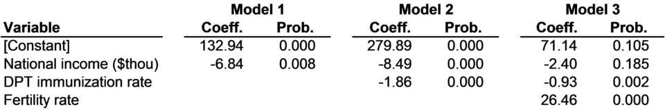 The results of three regression models to predict child mortality in sub-Saharan Africa are reported in Figure 7-15. Model 1 is a simple linear regression model with just one predictor, National income. Each additional $1000 of national income is associated with a decline in the child mortality rate of 6.84 children per 1000 children born in the country. This result is highly significant statistically.
