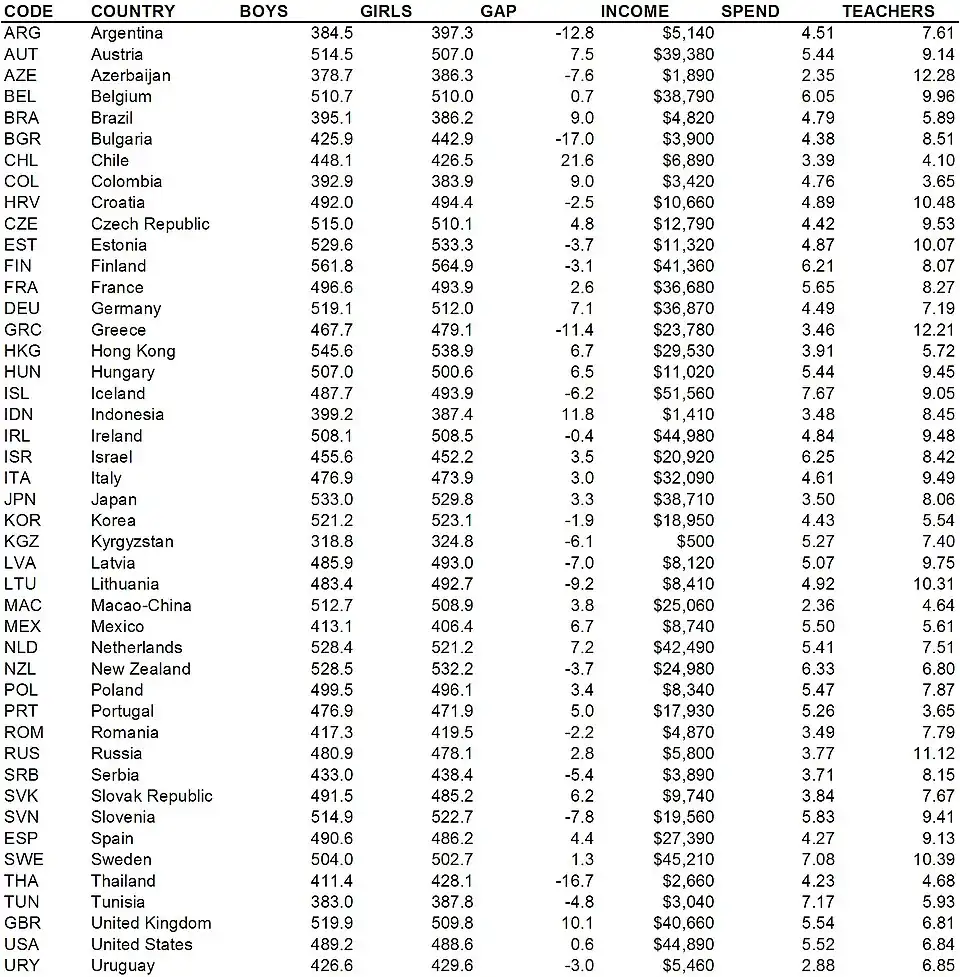 In addition to the usual metadata items, Figure 7-1 contains seven variables: BOYS -- The national mean PISA science score for boys GIRLS -- The national mean PISA science score for boys GAP -- The gender gap in science education (BOYS - GIRL) INCOME -- National income per person in US Dollars SPEND -- Education spending as a percentage of total national income TEACHERS -- The number of teachers per 100 students The PISA scores are constructed to have a mean of 500 for the OECD as a whole. National scores above 500 are above the OECD mean, while national scores below 500 are below the OECD mean. Since each country has a science score for both girls and boys, the database in Figure 7-1 is a paired sample. The mean difference between boys' and girls' scores is 0.36 points (the boys' mean is 0.36 points higher than the girls' mean). This difference is associated with a t statistic of t = 0.31 with 44 degrees of freedom. Based on this t statistic, there is a probability of 0.759 that the true mean difference between boys and girls could be 0. Since this probability of 75.9% very high, we would infer that it is entirely possible that there is no true difference between boys' and girls' performance in science. Even though there is no evidence for a gender gap overall across the 45 countries, there are many individual countries that have large gender gaps. The thirteen countries with a gender gap greater than 5 points are listed in Figure 7-2. Policy makers in these countries might ask social scientists to explain the gender gap and then recommend policies that could help reduce it. Three theories that might explain the gender gap in science scores are: (1) Income -- Richer countries have greater gender equality and so girls in richer countries are encouraged to study science more than girls in poorer countries (2) Spending -- High levels of educational spending tend to even out performance for all students, while countries that spend very little on education may give preference to boys over girls (3) Teachers -- Girls tend more than boys to learn through personal interaction, so having more teachers and smaller class sizes benefits girls' education more than boys' education