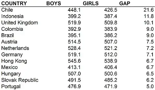 Parents and politicians are forever convinced that their children are not getting a good enough education. In part to meet parents' and politicians' demands to compare educational outcomes across countries, the Organization for Economic Cooperation and Development (OECD) administers the Program for International Student Assessment (PISA). The program organizes standardized tests comparing the knowledge of 15 year old students across in OECD member and other countries. The PISA tests focus very heavily on the topics that parents and politicians seem to worry most about -- math and science -- while ignoring other subjects that are probably much more useful for ensuring a happy and successful life, like literature, the arts, and of course the social sciences. Nonetheless, countries' PISA test results can be used to help answer important social scientific questions about national educational outcomes. One concern that is often raised by parents and politicians is the small number of women who choose to enter scientific and engineering professions. This may or may not be a problem -- after all, saying that there's a shortage of women in the sciences is the same as saying that there's a shortage of men in other areas -- but it is widely perceived to be a problem. Many OECD countries (including the United States) have special government-funded programs to increase the numbers of girls who study science and the numbers of women who choose scientific careers. Parents and politicians are particularly concerned that teenage girls don't seem to do as well in science in high school as teenage boys. Do teenage girls really underperform teenage boys in science? Cross-national data from the PISA tests can be used to answer this question. Data on PISA science scores are reported in Figure 7-1.