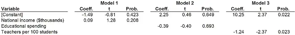7.3. The meaning of statistical controls When the purpose of multiple regression is to predict a specific outcome (like people's wage income levels), the statistical significance of the regression coefficients isn't really very important. Whether or not a true slope in a regression model is significantly different from 0 doesn't change the fact that the observed slope is the best available estimate of the true slope. In other words, when using regression for prediction the observed slopes are good enough. On the other hand, when using regression to evaluate hypotheses, the statistical significance of the slopes is crucially important. For example, in Figure 7-4 the observed slope for Administrative costs is so small that there is a very high probability that the true slope might be something like 0 (probability = 0.912 in Model 4). We infer from this that Administrative costs probably aren't an important cause of countries' ODA spending levels. Similarly, in Figure 7-6 the t statistic associated with Educational spending has a probability of 0.243, suggesting that Educational spending is not an important predictor of the gender gap in science scores. That's not surprising, since Educational spending was also not significant in its simple linear regression model (Model 2 in Figure 7-3). In contrast, National income was not significant in its simple linear regression model (Model 1 in Figure 7-3), but it is significant in the multiple regression model for the gender gap (Model 4 in Figure 7-6). In Figure 7-3, the observed slope for National income was 0.09 and the probability that the true slope might be 0 was 0.208. In Figure 7-6, the observed slope for National income was 0.16 and the probability that the true slope might be 0 was 0.048. Is the true slope for National income 0 or isn't it? Do richer countries have wider gender gaps or not? The simple answer to this question comes from the simple linear regression: higher National income is associated with higher gender gaps, but the relationship is weak, and the possibility that there really is no true relationship cannot be ruled out. A more nuanced answer comes from the multiple linear regression results. The multiple linear regression results tell the effect of National income controlling for Educational spending and Teachers per 100 students. Control variables are variables that are "held constant" in a multiple regression analysis in order to highlight the effect of a particular independent variable of interest. The multiple regression slope of 0.16 for National income means that every additional $1000 of National income is associated with an increase of 0.16 in a country's gender gap in science score, holding spending on education and the number of teachers in the country constant. This is different from the meaning of the 0.09 slope for National income in the simple linear regression model. Thinking of the slope in terms of predicted values, Model 1 predicts the gender gap using just National income. Countries that have higher incomes tend to have bigger gaps. But countries that have higher incomes also tend to have more spending on education and more teachers. When countries' incomes change, so do their spending and teacher levels. Predicting the gender gap for a rich country means predicting the gender gap for a country that spends a lot on education and has a lot of teachers. Since Educational spending and Teachers per 100 students aren't included in Model 1, the effect of National income includes the effects of everything that goes along with higher National income: bigger houses, better roads, more TV channels, nicer clothes -- and, of course, more Educational spending and more Teachers per 100 students. Model 4 predicts the gender gap using National income, Educational spending, and Teachers per 100 students all at the same time. In Model 4, higher National income still means bigger houses, better roads, more TV channels, and nicer clothes, but it doesn't mean more Educational spending or Teachers per 100 students. That's because Educational spending and Teachers per 100 students are "held constant" in making predictions using National income in Model 4. To see this, think about predicting the value of the gender gap. When all three independent variables are 0, the predicted gender gap is the intercept, 13.95 points. When National income goes up from $0 to $1000, the predicted gender gap is 13.95 + 1 x 0.16, or 14.11 points. When National income goes up to $2000, the predicted gender gap goes up another 0.16 points to 14.27 points. Every additional $1000 in income leads to another 0.16 point increase in the gender gap. What happened to Educational spending and Teachers per 100 students? They stayed at 0. They didn't change. The multiple linear regression slope of 0.16 for National income is the slope for National income considered independently of Educational spending and Teachers per 100 students. It is the slope for National income "holding constant" or "controlling for" Educational spending and Teachers per 100 students. The simple linear regression slope of 0.09 for National income is the slope for National income with any association between National income and the other two variables mixed in. The multiple regression in Model 4 examines the validity of the income theory of the gender gap independently of the spending theory and the teachers theory. There's nothing special about the order in which independent variables appear in regression models. The multiple linear regression in Model 4 also examines the validity of the spending theory independently of the income theory and the teachers theory, as well as the validity of the teachers theory independently of the income theory and the spending theory. Each variable is analytically equivalent, and regression results will be the same no matter what order the variables are entered. Why did the slope associated with National income go up between Model 1 and Model 4? There's