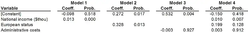 7.1. The multiple regression model Social scientists often have many competing theories to explain the same phenomenon. The gender gap in education might be due to national income, spending, or teachers. Countries' foreign aid spending levels might depend on their national incomes, European status, or aid efficiency levels. People's incomes might depend on their ages, races, genders, and levels of education. Moreover, these theories are not mutually exclusive. People's incomes differ by both race and gender, not one or the other. Most outcomes in the social sciences are the result of multiple causes. Models designed to study them must have multiple causes as well. Multicausal models are statistical models that have one dependent variable but two or more independent variables. Though many different kinds of multicausal models are possible, the most commonly used multicausal model is a straightforward extension of the linear regression model. Multiple linear regression models are statistical models in which expected values of the dependent variable are thought to rise or fall in a straight lines according to values of two or more independent variables. Multiple regression models work the same way as simple linear regression models except that they have additional independent variables. They produce expected values that are the values that a dependent variable would be expected to have based solely on values of the independent variables. They do this by determining the combination regression coefficients (slopes and intercepts) that minimizes the regression error standard deviation. In effect, multiple regression models take the observed values of the dependent variable and spread them out according to the values of two or more independent variables at the same time. An example of a social science phenomenon that has multiple causes is foreign aid. A multiple linear regression model for Official Development Assistance (ODA) spending is presented in Figure 7-4. This model integrates the three ODA spending models that were presented in Figure 6-9: one based on income (Model 1), one based on European status (Model 2), and one based on administrative costs (Model 3). In the simple linear regression models, both national income and European country status were found to be significantly related to ODA spending levels (the effect of administrative costs was non-significant). The multiple linear regression model (Model 4) spreads the total variability in ODA levels in the 20 rich countries across all three explanations at the same time. The coefficients in Model 4 represent the unique combination of coefficients that result in the smallest possible regression error standard deviation for the model as a whole.
