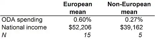In Model 4, the slope for national income is slightly smaller than it was in Model 1 (0.010 versus 0.013). Although it is smaller, it is still statistically significant (probability = .007 or 0.7%). As countries get richer, they give more of their national incomes in ODA spending. The slope for European status has also declined in Model 4, but much more so (from 0.328 to 0.199). The new, smaller slope for European status is no longer statistically significant (probability = 0.128 or 12.8%). European countries still have observed ODA spending levels that are 0.199% higher than non-European countries, but this difference is not statistically significant. In other words, the results reported in Model 4 indicate that the ODA spending difference between European and non-European countries could be due to random chance error. In Model 4 as in Model 3 administrative costs have no measurable impact on ODA spending. The mean level of ODA spending across all 20 countries is 0.52% of national income with a standard deviation of 0.268%. The regression error standard deviation for Model 4 is 0.185%. The multiple regression model has substantially less error than the simple mean model. A portion of countries' overall deviations from the mean spending level of 0.52% can be traced to countries' European status (European or non-European), but much more can be traced to countries' national income levels (rich versus poor). The contrast between the coefficients of European status in Model 2 versus Model 4 indicates that part of the difference between European and non-European countries' levels of ODA spending is due to the fact that European countries tend to be richer than non-European countries. This is illustrated in Figure 7-5.