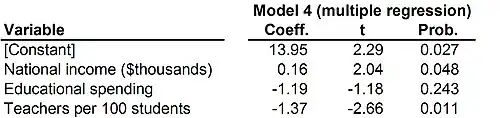 The mean level of ODA spending for European countries is much higher than the mean level for non-European countries, but so is the mean level of national income. Do European countries spend so much on foreign aid because they're European, or because they're rich? The multiple regression model suggests that the true answer is a combination of the two explanations. European countries do spend a lot on ODA just like other rich countries do, but they spend even more than would be expected just based on their national income levels. How much more? The best estimate is that European countries spend 0.199% more of their national income on ODA than do other countries of similar income levels. This figure comes from the coefficient for European status in Model 4. The difference of 0.199% is not statistically significantly different from 0%, but it is still the best estimate of the difference. In other words, out best guess is that being European makes a country spend 0.199% more on aid than it otherwise would based on its income level alone. Just as European countries may spend more on aid because they have higher incomes, it is possible that higher income countries spend more on aid in part because many of them are European. In Figure 7-4, the slope for national income is 0.013 in Model 1, but this drops to 0.010 in Model 4. The slope for national income is lower in the multiple regression model (Model 4) than in the simple linear regression model (Model 1) because in the multiple regression model the total variability in ODA spending levels is split between national income and European status. Ultimately, what multiple linear regression does is split the total variability in the dependent variable among all the independent variables. In essence, the multiple independent variables are all competing for the same available variability. This usually (but not always) shows up as smaller slopes in the multiple regression model. In Figure 7-3 three different independent variables were used to explain the gender gap in science scores in three separate linear regression models. The three independent variables were national income, educational spending, and teachers per 100 students. Figure 7-6 presents a multiple linear regression model of the gender gap in science that uses all three variables. The slopes in Figure 7-6 are actually stronger, not weaker, than those from the original three models. This can only happen when the multiple independent variables complement each other, capturing different aspects of the dependent variable. Some countries have large gender gaps because they have high incomes but also have small gender gaps because they have lots of teachers. In the simple linear regression models these two effects cancel each other out, but in the multiple linear regression model the two separate effects are revealed.