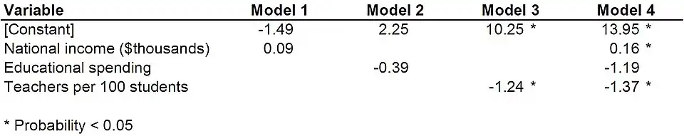 The results completely contradict the income theory. The slope in Model 1 of Figure 7-3 indicates that richer countries actually have bigger gender gaps than poor countries (though the effect is not statistically significant). On the other hand, the results do tend to confirm the spending theory, but the effect of spending is not statistically significant. In Model 2, the probability of 0.693 indicates that there is a very large probability that the true effect of spending is 0. The only strong result in Figure 7-3 is the slope for teachers. According to the slope in model 3, every additional teacher per 100 students tends to reduce the gender gap by more than 1 point. This result is unlikely to have occurred by chance (probability less than 2.3%). The policy implication seems to be that more teachers are required if a country wants to reduce its gender gap in science education. Obviously, hiring more teachers costs money. Yet the relationship between spending and the gender gap is not significantly different from 0. Moreover, it's possible that only rich countries can afford to increase their spending on education. In short, it is difficult to change any one of these three determinants of the gender gap without changing the others at the same time. What we really need is an integrated model that take all three variables into account at the same time. For that, new statistical tools are required.