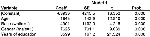 7.2. Prediction using multiple regression Multiple linear regression models can be used to calculate predicted values of dependent variables in exactly the same way as simple linear regression. Since multiple linear regression models include more predictors than simple regression models, they tend to produce more accurate predictions. Predictors are the independent variables in regression models. A multiple regression model using four predictors to predict the incomes of employed American twentysomethings is presented in Figure 7-8. All four predictors (age, race, gender, and education) have highly significant slopes. Based on the t statistics, race is the least important of the four independent variables, but even race is highly significant statistically. Note that the intercept of this model is not very meaningful on its own, but is nonetheless necessary for calculating predicted values.