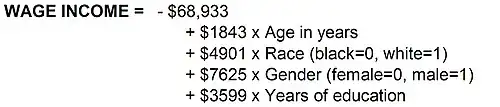 The equation for wage income based on the regression coefficients reported in Figure 7-8 is spelled out in Figure 7-9. Predicted income starts out at -$68,933 for a black female age 0 who has no education. Of course, this is a meaningless extrapolation of the regression analysis: newborn babies don't have incomes or education. Nonetheless, it is the starting point for calculating predicted values. Starting at -$68,933, each additional year of age brings $1843 in income, being white adds $4901 to a person's predicted income, being male adds $7625 to a person's predicted income, and each additional year of education brings $3599 in income. Using the equation in Figure 7-9, the incomes of any white or black Americans in their twenties can be predicted. The predictions may not be correct, but they will be more correct than simply predicting people's incomes based on the mean income for American twentysomethings.