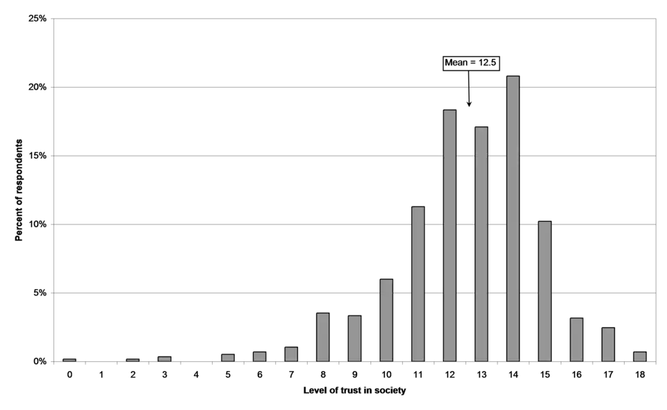 Many people worry that modern society is alienating. Alienation means that people feel disconnected from larger society. Alienation was one of the first problems studied by the sociologists who founded the discipline in the late 19th century, and it continues to be a major concern today. A major symptom of alienation is a lack of trust in society. In small, closed communities where everyone knows everyone else, people have the opportunity to develop trusting relationships over years of mutual interaction. In modern societies, people end up being strangers to the people around them in stores and restaurants, their neighbors, and even their extended families. People still have friends, but their friends are spread out in wide networks. The era of village societies when you were likely to marry your next-door neighbor disappeared long ago. Nonetheless, trust is extremely important for the functioning of modern society, especially in democratic countries. If people don't have trust in society, they won't help their neighbors in times of need, enter into long-term contracts like university degree programs, or participate in democratic elections. At the most basic level, trust in society is necessary for society to function at all. Without it, we're all on our own. The World Values Survey (WVS), conducted in more than 80 countries, includes six questions about trust in society. They are: How much do you trust your family? How much do you trust people in your neighborhood? How much do you trust people you know personally? How much do you trust people you meet for the first time? How much do you trust people of another religion? How much do you trust people of another nationality? Each question can be answered on four levels, ranging from 0 = "No trust at all" through 3 = "Trust completely." An index of overall trust in society can be calculated by adding together each respondent's answers to all six questions. This index, "Trust in society," then ranges from a possible low score of 0 (the respondent answers "No trust at all" on all six questions) to 18 (the respondent answers "Trust completely" on all six questions). Of course, most people fall somewhere in the middle. Using data from the United Kingdom edition of the 2006 World Values Survey (WVS), the mean level of trust in society was 12.5 with a standard deviation of 2.4. Most people in the United Kingdom have a high level of trust in society. The full distribution of trust in society in the United Kingdom is plotted in Figure 9-1.